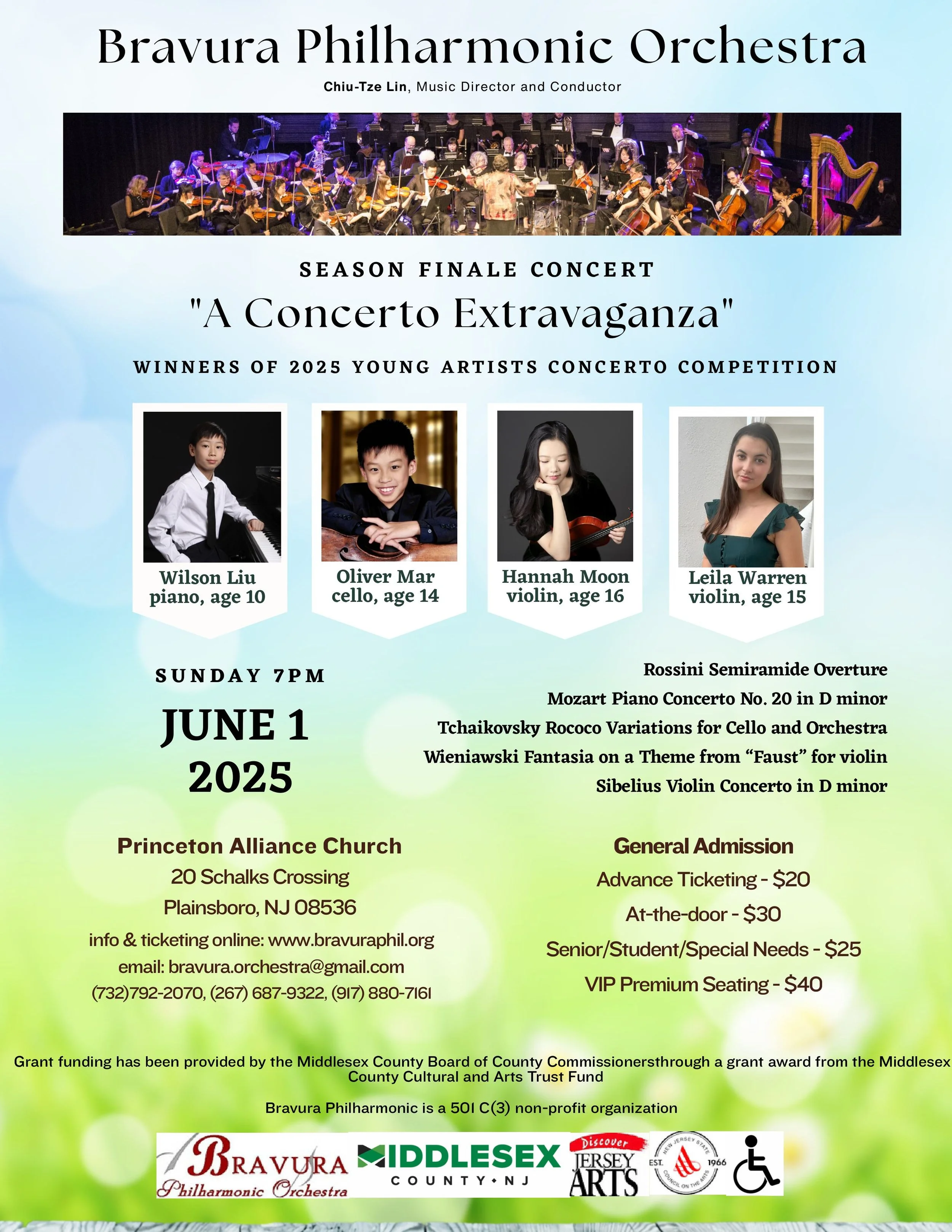 Today, our adjudicators will listen to the 16 in-person performances, having previously viewed the video recordings. The competition is open to the public. Recording the contestants is encouraged, as this provides an excellent educational opportunity for them. However, the recording of performers other than your own participant is not permitted. The adjudicators will choose a maximum of four Gold Medal winners to perform their concertos at a concert featuring them with the Bravura Philharmonic Orchestra on Sunday, June 7, 2026. In addition, the judges will select a winner from contestants residing in Middlesex or Mercer Counties - the local community where the Bravura Philharmonic Orchestra is based.